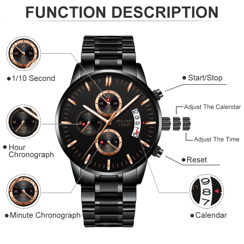 GOLDEN HOUR WATCH ➡️ Luxury Stainless Steel ➡️ High-grade hardness glass ➡️ Waterproof ➡️ Night illumination ➡️ Active Chronograph ➡️ Automatic Date Function